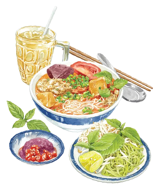 Xứ Huế, cố đô hoa lệ, mang đến hương vị đậm đà và hơi hướng hoàng gia. Bún Bò Huế nổi bật với vị cay nồng, sắc đỏ của sa tế và sự hòa quyện của thịt bò, giò heo. Các loại bánh đặc trưng như Bánh Bèo, Bánh Lọc, Bánh Nậm được trình bày tinh tế trong những chiếc chén, lá nhỏ xinh, chấm cùng nước mắm ớt.